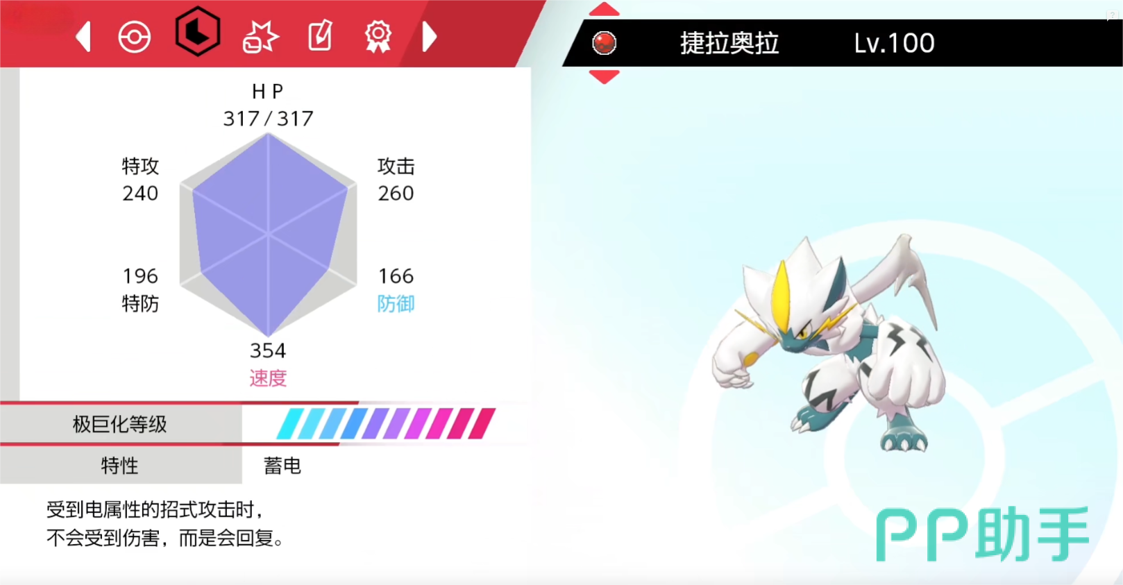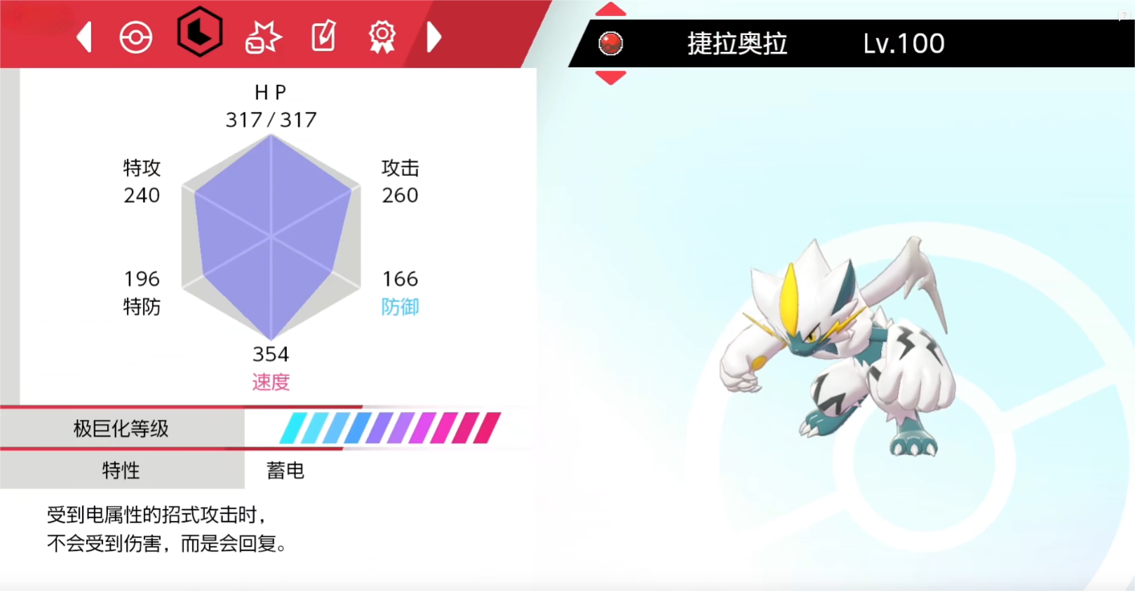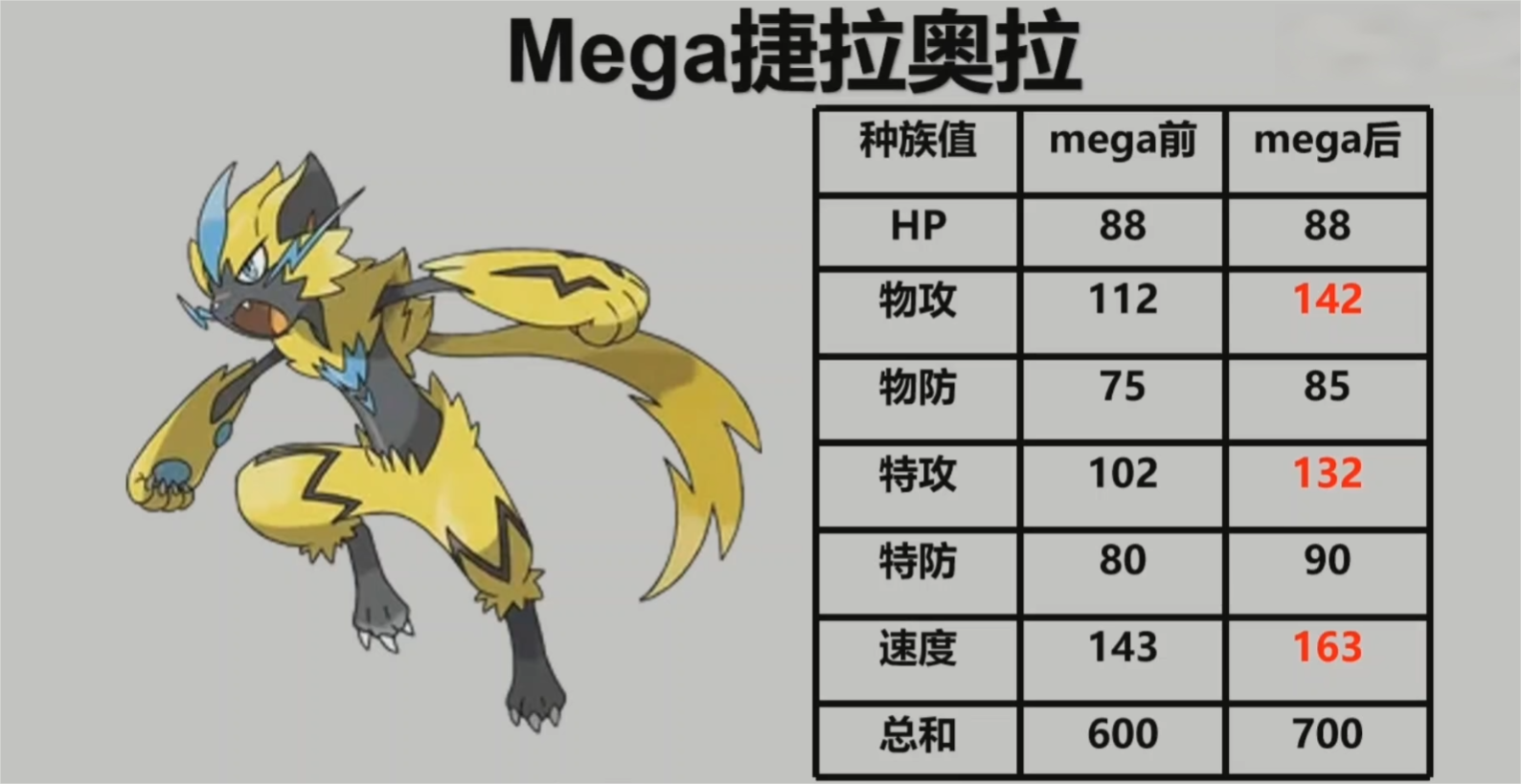 在未进行Mega进化前,捷拉奥拉的速度种族值高达143,使其具备极强的先手优势,能够快过绝大多数对手完成出招。尽管耐久方面略显薄弱,但其双攻数值均接近100,无论是物理输出还是特殊攻击都能胜任,具备出色的双刀作战潜力。经过Mega进化后,核心能力进一步提升,尤其是速度与双攻得到显著增强,搭配其专属特性“蓄电”,可在实战中灵活担任主力输出或功能性辅助角色。