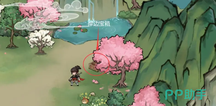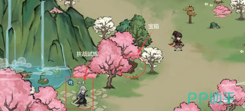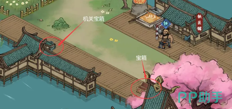 玩家进入燕子坞后,应立即探索桃花林。在这里大家可以找到两个宝箱和一个试炼,还有采集点。接着,前往村内,与守卫对话后,上方的迷雾将被解锁,这时你可以按照图示位置搜集资源。进入码头后,在三个角落中可以找到两个宝箱和一处野外物资。