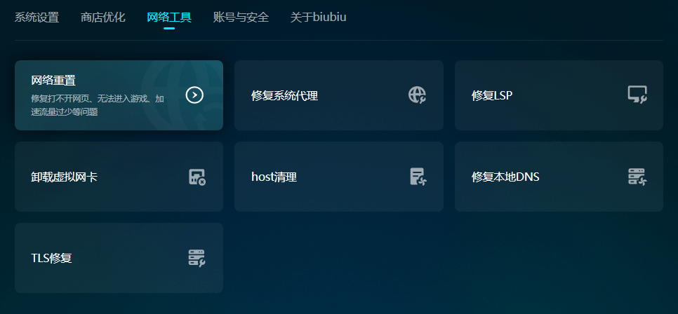 如果你对加速效果感觉还差点意思,或者电脑时不时就会跳出加载失败的页面,那么还能在biubiu工具箱里面找到对应工具来修复它们,biubiu准备的7款工具都很实用,除了修复系统代理以外,还能清理host,网络出现的疑难杂症都帮大家解决好,小伙伴们就能专心玩游戏了。