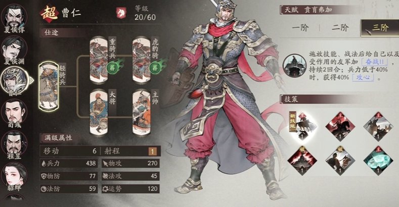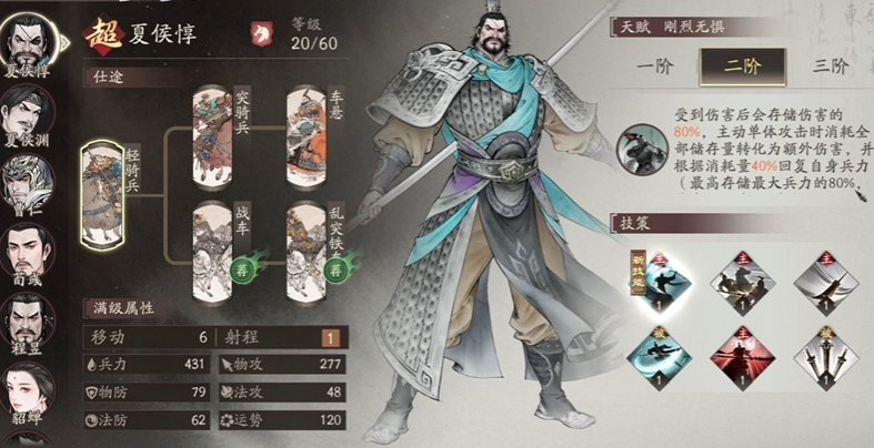 第二梯队武将无需急于升阶。夏侯渊在二阶时获得15%暴击加成,并可在残血时回复32%兵力,在缺乏治疗型武将的情况下具备极高生存价值。但其三阶提升幅度有限,不必急于突破。而张郃则需升至三阶才真正展现强度,届时武将克制效果提升15%,若搭配副将藏霸,可叠加至20%增伤,在挑战高难度关卡时优势明显。