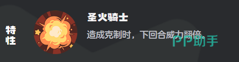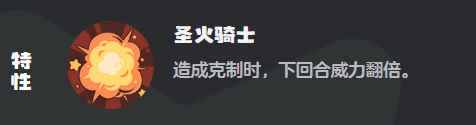 其核心机制源于专属特性【圣火骑士】:每当炽心勇狮造成属性克制伤害后,下回合所有攻击技能的基础威力将提升至200%。该效果不依赖命中判定,仅需达成克制即可触发,具备高度稳定性。实战中,首回合精准命中水系目标后,次回合输出直接翻倍;若敌方缺乏有效控场或清场手段,第三、第四回合的累计伤害将呈指数级攀升,形成难以逆转的压制局面。