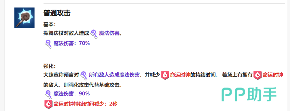此外,当“巴巴”撞击到带有“命运之钟”的敌人时,还能使其倒计时缩短15秒,极大提升了状态爆发的节奏。玛卡莎的普通攻击分为基础形态与强化形态两种:基础攻击为单体挥击法杖,造成70%的魔法伤害,无额外附加效果;而当满足特定条件时触发的强化普攻,则会对全体敌人造成群体魔法伤害,并减少“命运之钟”的持续时间2秒。更重要的是,若场上存在已标记“命运之钟”的敌人,强化普攻将自动替代基础攻击释放,此时伤害提升至90%,进一步增强清场与控场能力。