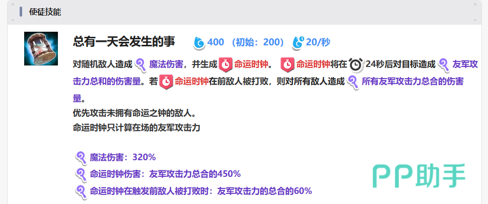 一旦“命运之钟”成功施加,将在接下来的24秒内持续生效。若在此期间目标被击败,则所有剩余的累积伤害将瞬间结算,总量相当于友军攻击力总和的450%。但如果目标在“命运之钟”尚未触发前就被消灭,则只能触发其60%的基础伤害值。因此,在实际战斗中应尽量确保该状态激活后再完成击杀,以便最大化输出收益。