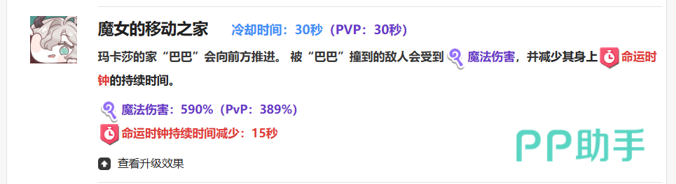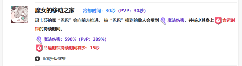 玛卡莎的第二个技能是“魔女的移动之家”,拥有极短的30秒冷却时间。值得注意的是,该技能在推图和PVP两种模式下的冷却完全一致,不会因场景变化而产生差异,这使得她在多种战斗环境中都具备稳定的发挥空间。释放此技能后,玛卡莎的房屋“巴巴”会出现在战场上并向前推进,撞击路径上的所有敌人,造成大额魔法伤害。在常规战斗中,该技能可带来590%的魔法伤害;而在PVP环境下则调整为389%,尽管有所削弱,但仍处于可接受范围。