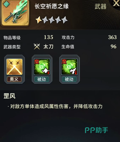 长空祈愿之缘:风属性太刀,基础攻击力363,生命值96。数值虽不突出,但奥义机制高度契合风系阵容的运营逻辑——当携带者为风属性角色且自身生命比例越高时,获得的攻击力加成越显著。因此该武器要求玩家优先保障风系角色生存质量,配合护盾、治疗或减伤类支援角色使用,可在高血量状态下释放最大战术价值,是风队中不可替代的“状态型增幅器”。