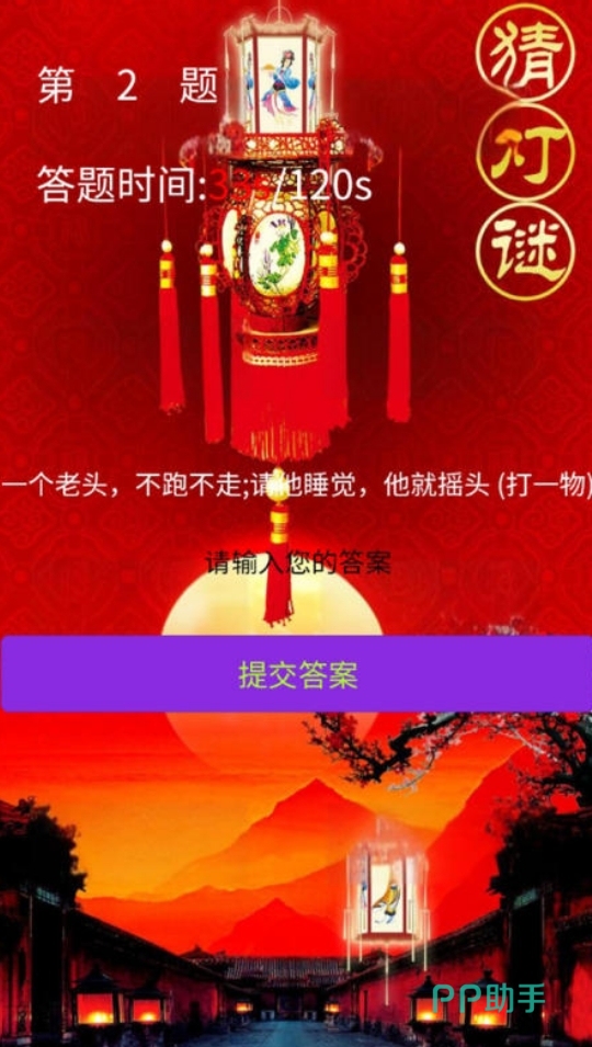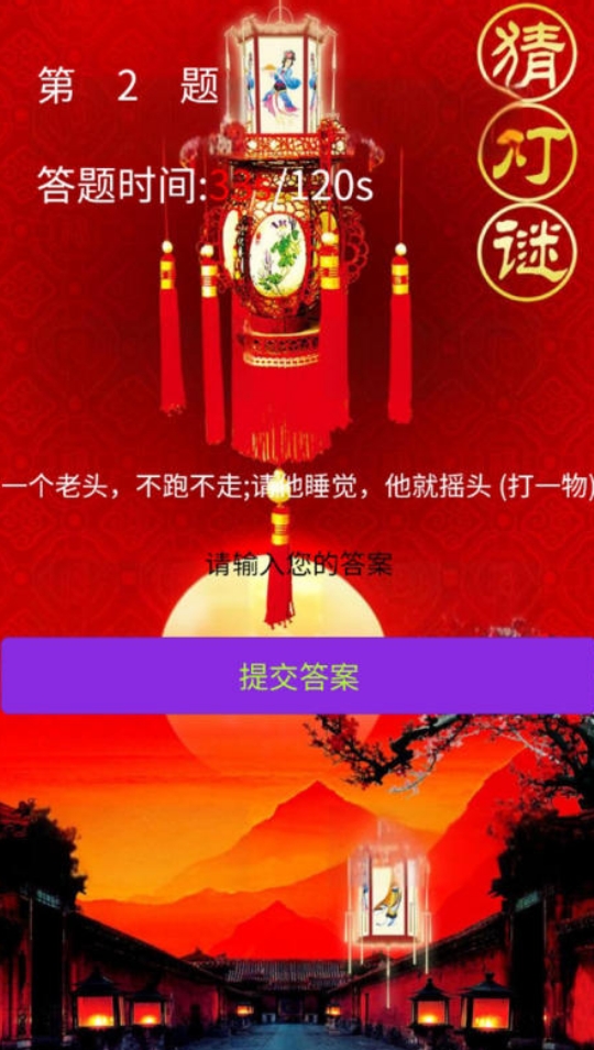 《你猜我猜灯谜》汇总了多道灯谜供玩家们去挑战,并在作答时需要人们手动去输入灯谜的答案,玩起来颇有种在集市上进行灯谜抢答的乐趣。每道灯谜都有120秒的答题时限,但好在超过后可重复多次的进行挑战,所以玩起来并不麻烦。而且只要答对了谜题就能保留自己的闯关进度,方便自己下一次再玩时能接着继续去挑战。