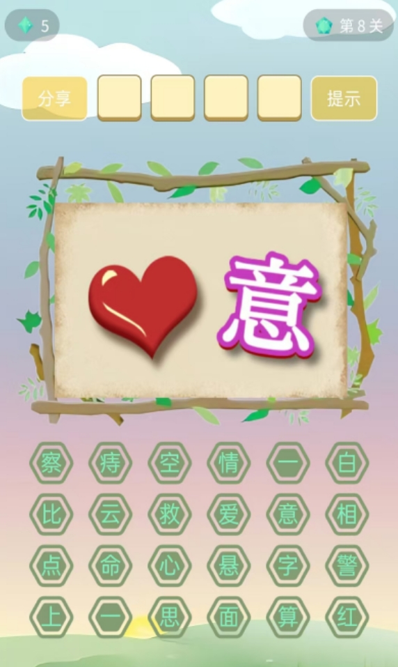 这部游戏的玩法非常简单易懂,每道关卡都会出现图片或文字作为谜面,只要解开谜面并从关卡给出的文字里组出正确的成语即可。游戏是以闯关的形式进行的,只有解开了上一题后,才能进入下一关继续挑战。当然,它也为各位设计了提示功能,如果玩家迟迟猜不出游戏所给出的谜题,也可使用一次提示机会来直接看答案。