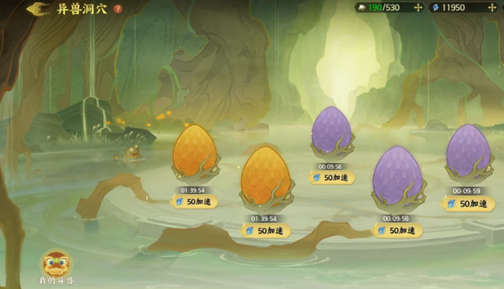 竟然是一个山海经题材的游戏,自然会有大量的异兽可以让玩家使用,想要获取异兽,玩家首先需要达成几个条件,首先就是需要解锁生命之树,只有解锁之后才能看到异兽洞穴,进入到洞穴之后就可以获得异兽蛋,玩家可以通过孵化,获得专属的异兽,每次最多可以同时孵化5个蛋,这样玩家就有机会获得5个不同的角色。