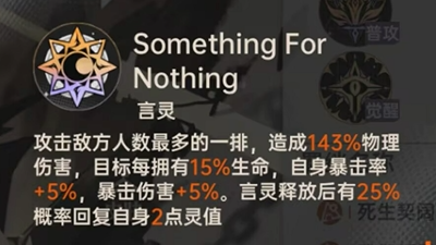 路明非的核心输出技能名为“Something for Nothing”,定位为中排单体物理攻击技。该技能具备独特判定逻辑:目标当前生命值越高,暴击触发概率越显著;同时有25%几率为自身恢复2点灵值,有效缓解资源压力,增强连招节奏控制能力。