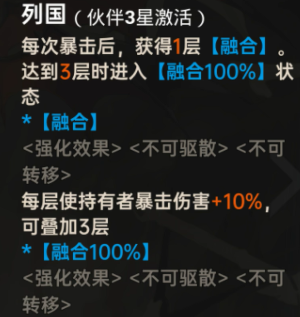 其特性系统随星级成长逐步解锁关键增益。升至三星时激活“融合状态”,可提升爆伤,并在累计四次触发后达成100%融合度,同步提高暴击率及附加基于最大生命值的额外伤害。五星满阶后,暴击将额外触发吸血效果与增伤buff,显著强化持续作战中的生存效率与爆发上限。