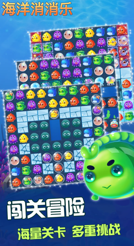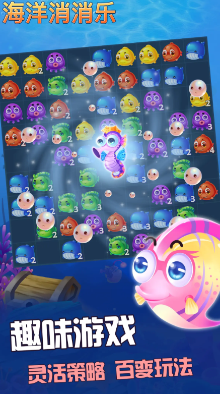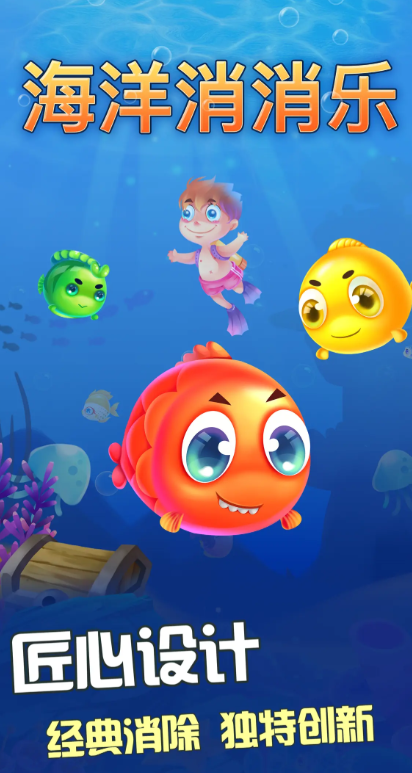 本作采用经典的三消机制作为核心玩法,玩家将在游戏中扮演拯救者角色,帮助被困的小鲤鱼、小金鱼和小章鱼脱离困境。通过滑动操作调整海洋生物的位置,当三个或更多相同单位连成一线时,即可触发消除效果。