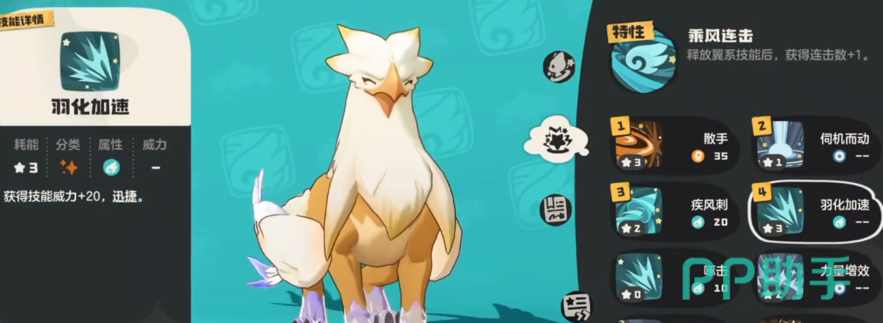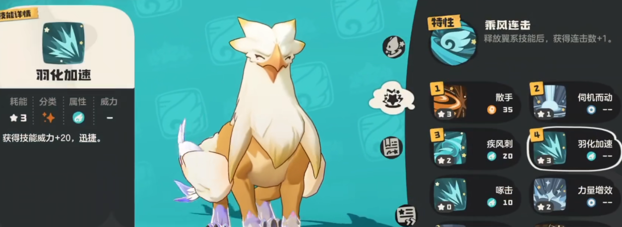推荐常用技能组合为:散手、伺机而动、疾风刺、羽化加速。其中,“羽化加速”几乎是必带技能,在对手处于聚能、强化防御或切换精灵的瞬间出场释放,既能叠加连击层数,又能提高伤害输出,实现高效压制,形成战场主动权。