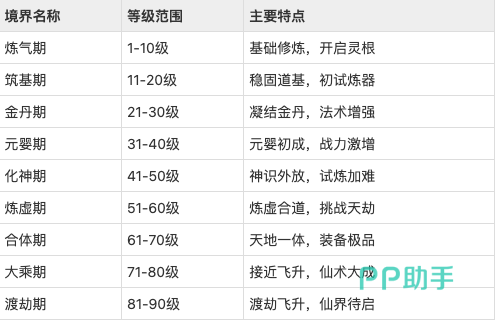 游戏中修真体系共设九大境界,依次为:炼气期、筑基期、金丹期、元婴期、化神期、炼虚期、合体期、大乘期、渡劫期。每提升10级即可突破至下一境界,各阶段不仅对应差异化角色属性成长,更解锁专属玩法权限与功能模块。其中,炼气期为入门奠基阶段,可激活灵根资质;筑基期侧重根基稳固,首次开放炼器功能;金丹期则需凝练金丹,法术强度与技能多样性显著跃升。其余六大境界的核心机制要点,已系统梳理为对照表格,便于道友查阅参考。