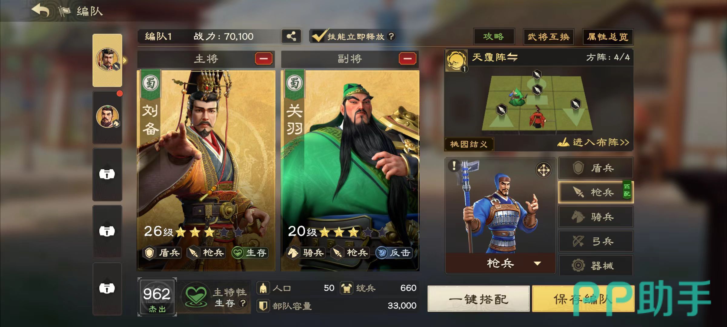 第二套阵容则围绕反击机制打造,选用刘备与关羽组成枪兵反击体系。刘备作为主将,拥有强大的生存辅助能力,其减伤与兵力恢复效果能极大提升队伍续航;关羽则负责提供反击概率加成与怒气积累,增强反打输出能力。这套组合适合在持久战中发挥优势,通过刘备的治疗维持血线,配合关羽的高频反击打出可观伤害。刘备的四星被动是该阵容的关键,四星后治疗效果大幅提升;关羽则需重点升级三星与四星被动技能。培养顺序上,建议先将刘备的三星与四星技能点满,再集中资源提升关羽的四星能力。