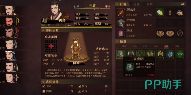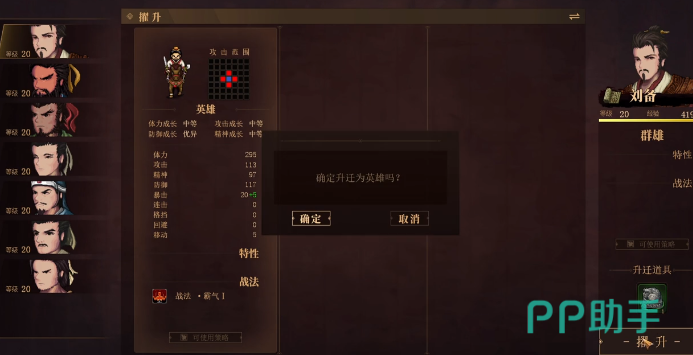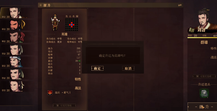 在游戏一开始时,玩家就可以得到很多的升迁道具。等到玩家的武将等级20级之后就可以使用。在体验游戏时,武将提升到20级就没有办法继续的升级,这是因为需要先完成升迁的操作。