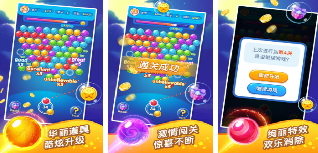 游戏会将泡泡主题作为主要的核心,玩家可以通过竖屏单指操作,在发射泡泡之后就可以把这些泡泡全部的消除。只需要符合对应的数量,就可以顺利的过关。在游戏中整个操作是比较快捷的,可以在碎片化的时间内去完成。在消除时还会拥有一个华丽的特效泡泡,在碰撞的过程中还会有一种悦耳的声音,确实是比较解压的。