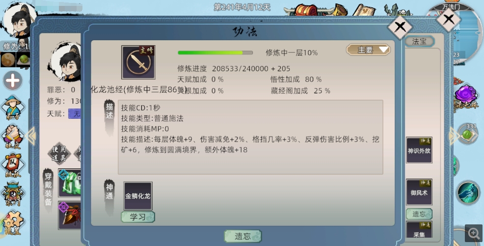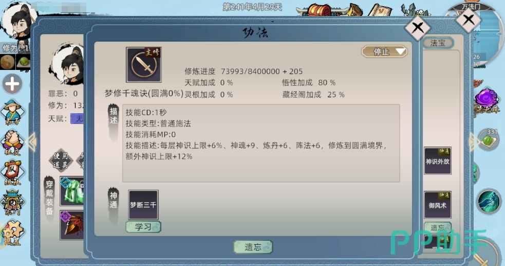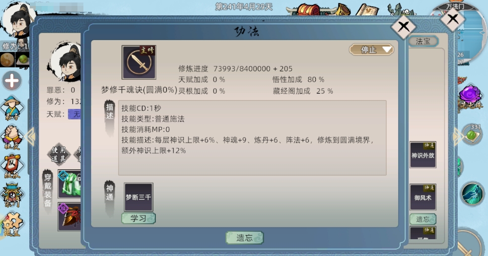 神识功法可以提高神魂和神识的上限,目前,神识功法的种类较为有限,同等级的功法在属性增加方面基本相同,因此在选择时应优先考虑高等级的功法。在同等级的选择中,玩家应重点关注功法所附带的神通,特别是控制类的神通,因为神识的控制效果是法力护盾无法抵挡的。