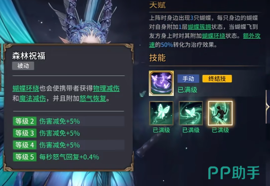 而她的被动技能“轻柔蝶翼”和“森林祝福”更是锦上添花。“轻柔蝶翼”每2秒会有50%的概率帮助队友驱散负面状态,而“森林祝福”则会赋予队友物理和魔法双重减伤效果,还能让携带“蝴蝶环绕”的单位快速恢复怒气,这也让塔露拉成为队伍中的一个怒气加油站和状态清除器。