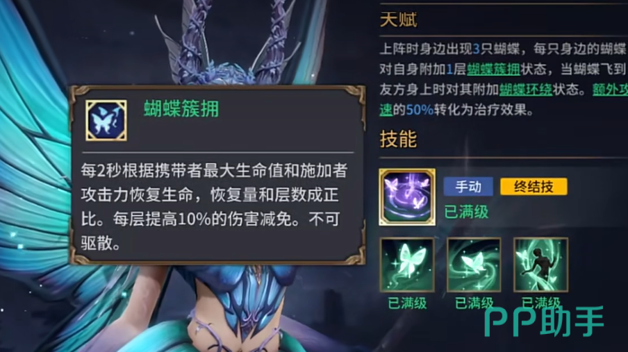 塔露拉的天赋一上场,就能看到她身边翩翩飞舞的三只蝴蝶。每只蝴蝶都会赋予塔露拉自己和队友一个叫做“蝴蝶簇拥”的状态。别看这个名字有点小清新,它的实际作用可不简单——每当蝴蝶飞到友方身上时,便会为队友带来“蝴蝶环绕”的效果。这一状态可是非常强大的,它能驱散队友身上的有害状态,让你的队友免于被负面效果折磨。