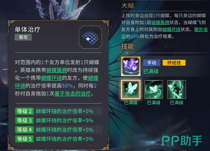 塔露拉的普攻可能看似简单,但却有着不容小觑的效果。她的攻击会对范围内的一名友方发射蝴蝶,这可不是普通的蝴蝶哦!这些蝴蝶会在友方英雄身边围绕,为其提供50%的治疗效果加成,而且每2秒还会给予塔露拉自己一次基于攻击力的治疗,这让她不仅是个强力的辅助,还能为自己持续恢复生命值,保持战场上的持久力。