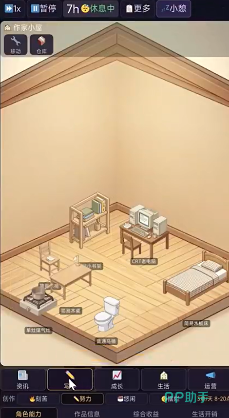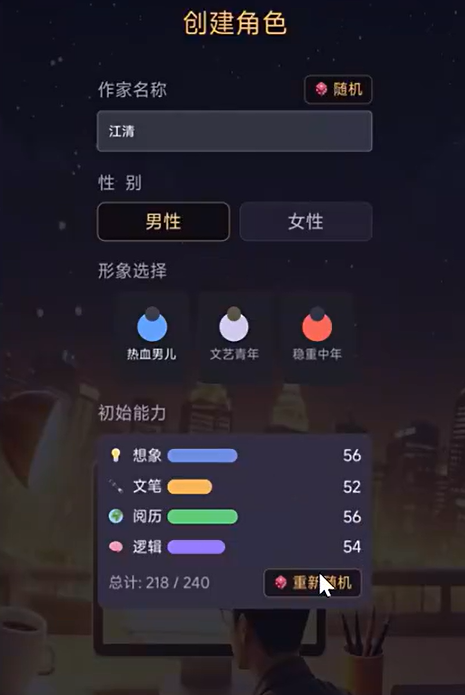角色创建完成后,进入天赋选择环节,可自由搭配“灵感”“体力”“消耗”三大核心成长方向。例如侧重内容创新性可优先提升灵感值,偏好持续输出则强化体力储备。正式进入游戏后,玩家将置身于专属写作空间,房间内配备书桌、电脑、资料架等真实元素。除浏览行业资讯外,点击“开始写作”即可启动码字流程,逐步构建属于自己的小说世界。