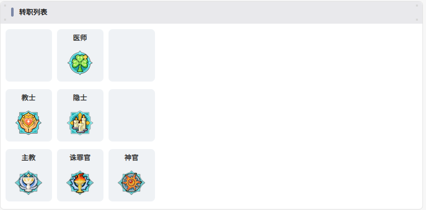 目前可供选择的六大转职方向为:医师、教士、隐士、主教、诛罪官、神官。各职业在治疗响应速度、单体/群体恢复量、护盾强度及减伤持续时间等方面存在差异化定位。例如,医师侧重高频小剂量回血与状态净化;主教则强化大范围护盾覆盖与团队减伤叠加;而诛罪官在提供治疗的同时,附加对敌方施加负面效果的能力。玩家可根据实际战斗场景灵活配置。