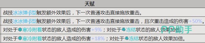 伊冯的核心战斗逻辑围绕“科技连击”展开:普攻五段式节奏稳定,每次命中可积累连击层数;当触发技能协同效果后,下一次普攻将自动转化为重击。升至二阶后,该重击伤害提升50%,显著强化单体爆发能力。其天赋“冰点”深度绑定寒冷体系——一阶状态下对已附着寒冷效果的目标增伤9%,若目标处于冻结状态,则增伤效果翻倍;升至二阶后,基础增伤提升至18%,使控场与输出形成高效联动闭环。
