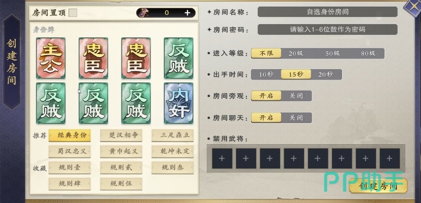 先来说说大家非常熟悉的身份模式吧,在这个模式中游戏提供了丰富多样的身份选择,除了经典的主公、忠臣、反贼、内奸这几种身份设定外,还别出心裁地加入了自选身份模式,这一创新设计让玩家能够根据自己的喜好和游戏局势来定制独特的游戏体验,在身份模式里,房主拥有特殊的权利,可以提前精心设置参与游戏的身份,这里的身份选择极为丰富,涵盖了诸如主公、先主、潜龙、明主、忠臣、储君、上将、禁军、反贼、盟主、军师、先锋、内奸、黄巾、刺客、伪帝等多达 16 种不同的身份。