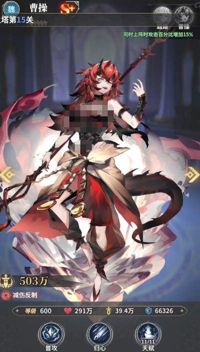 曹操是当前版本中减伤机制最扎实的防御向武姬之一。其技能“归心”可在行动阶段对全体敌人造成80%法伤,并立即赋予自身30%最终减伤,持续一回合。随着星级提升,其被动减伤能力持续成长:基础减伤率为3%,但可通过层数叠加,最高达60%。该成长曲线使其在中后期团战中具备极强的站场韧性与反打空间,特别适配需要前排持续承伤、等待关键技能冷却的慢节奏阵容。