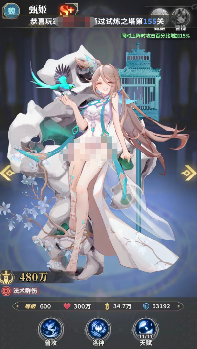 郭嘉定位为高覆盖率法术输出型武姬。其核心技能可对全体敌方单位造成80%基础法伤,并有50%概率附加诅咒效果,实现持续控制。值得注意的是,当郭嘉被击退时,将自动为我方当前生命上限最高的友方单位恢复30%生命上限值,并再次释放“遗计”;该效果在11星解锁。此外,她在后期战斗中若受到伤害,有50%概率为我方攻击力最高的单位提供怒气增益,显著提升主力输出角色大招释放频率,是强化爆发节奏的关键辅助型法C。