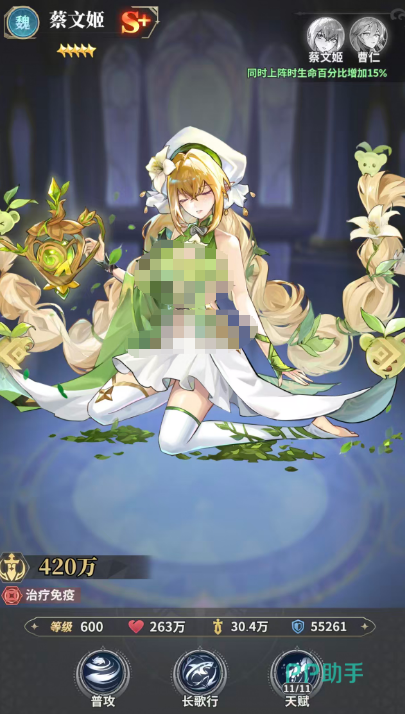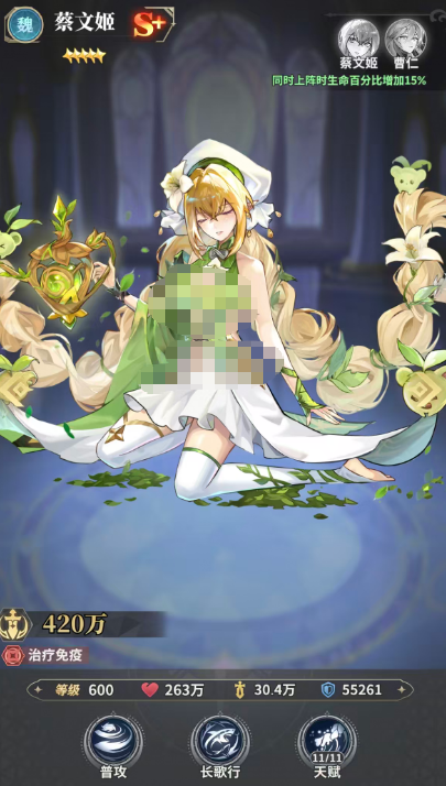 蔡文姬是当前版本中唯一具备异常状态免疫机制的治疗型武姬。其“长歌行”技能可为我方前排三名单位恢复95%最大生命值,并赋予“神护”状态——该状态可在下一次受到异常状态影响时自动清除一层并免疫该次异常效果。同时,她与同阵营武将共同上阵时,可额外提供10%减伤与10%增伤。若搭配曹仁组成专属组合,还可激活生命百分比+15%的羁绊加成,极大提升队伍整体续航与抗控能力,是高难度副本与PVP对抗中的战略级保核人选。