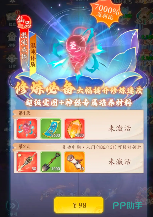 游戏内首充奖励为天品白虎宠物,具备显著体质加成,在前期推图与PVE战斗中表现突出;若追求更高战力上限,可选择98元混沌圣体神器档位,除提升修炼速度外,同步赠送超级宝图及专属培养材料,大幅压缩资源搜集周期,使玩家专注核心玩法如破境突破与主线任务推进。