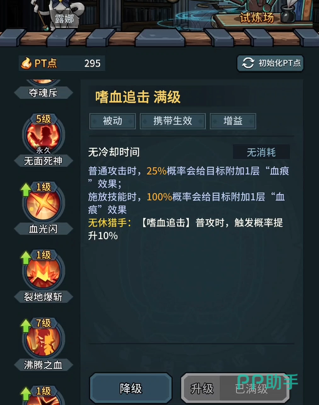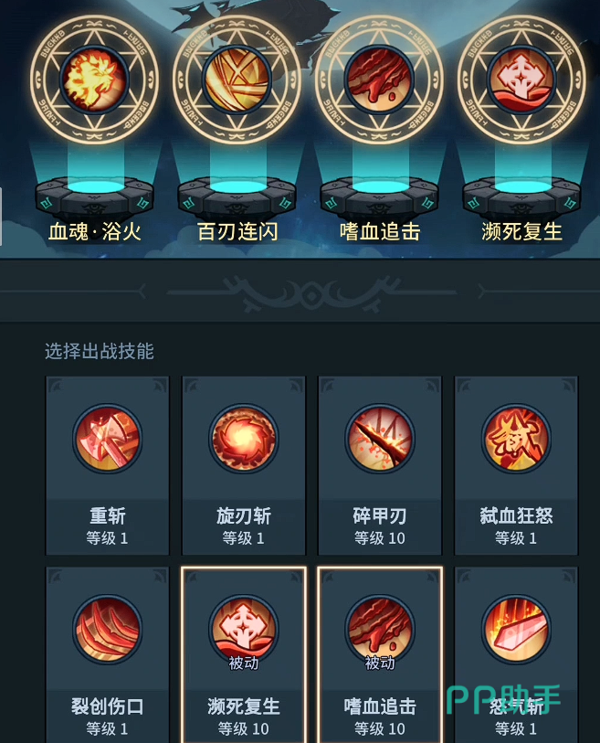 推荐携带的四组核心技能为:血魂浴火、嗜血追击、连闪、复生。该配置兼顾伤害梯度、状态压制、范围清场及容错保障,形成闭环式战斗节奏。其中,复生技能具备多次触发能力,显著降低操作失误带来的通关失败风险,是稳定推进高层数地下城的重要支撑。
