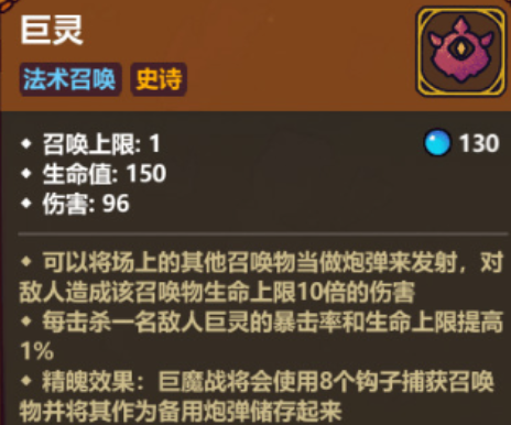 巨灵作为召唤系单位中的成长型代表,初始生命值为150,其独特机制在于每次击杀敌人都会使自身生命上限和暴击率提升1%。它的攻击方式多样,不仅可通过炮管进行强力砸击,还能额外生成辅助单位协同作战,持续增强输出能力。随着战局推进,巨灵将成为团队中不可忽视的核心战力。
