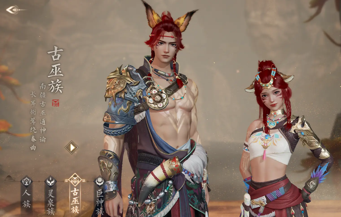 古巫族诞生于南疆瘴气弥漫之地,是自然孕育的神秘存在。其外貌融合了人类与灵兽特征,拥有兽耳与长尾,展现出独特的异族魅力。身形敏捷灵动,行动如风,具备幻化为多种灵兽形态的能力,不仅视觉表现力强,也赋予角色更多个性化展示空间。