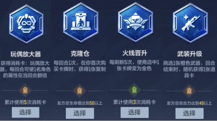第一,拒绝盲目追求高阶效果。若任务条件明显超出当前运营能力(如高阵亡数、多刷新次数等),应主动降级选择低门槛方案。“克隆仓”(每回合购卡获1张复制)、“火线晋升”(每刷新5次使1张卡变金色)、“武装升级”(选定橙色武器,回合结束随机得1张道具卡)、“玩偶放大器”(每回合使1名角色当回合属性翻倍)均为容错率高、启动速度快的稳妥选项。