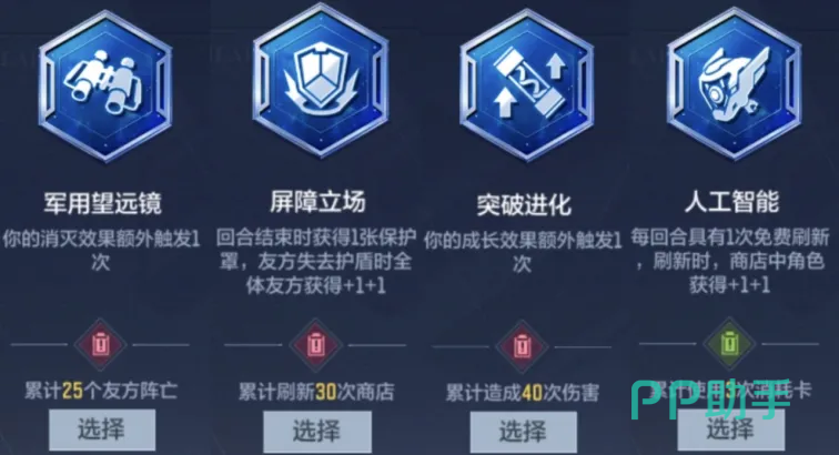 本机制取代了过往赛季中固定的Buff发放环节,于每局开局第3回合强制触发。系统将同步提供三项独立升级方案,每项均包含两个核心要素:一是可激活的战术效果,二是必须完成的前置任务条件。区别于即刻生效的传统Buff,所有升级效果均需满足对应任务后才正式解锁。任务难度与效果强度呈正相关——例如“军用望远镜”要求累计25名友方角色阵亡方可激活,而“克隆仓”仅需每回合购买卡牌时自动复制1张。玩家需综合评估己方阵容类型、当前经济状况、对手压制强度及剩余回合预期,做出兼具可行性与收益比的决策。
