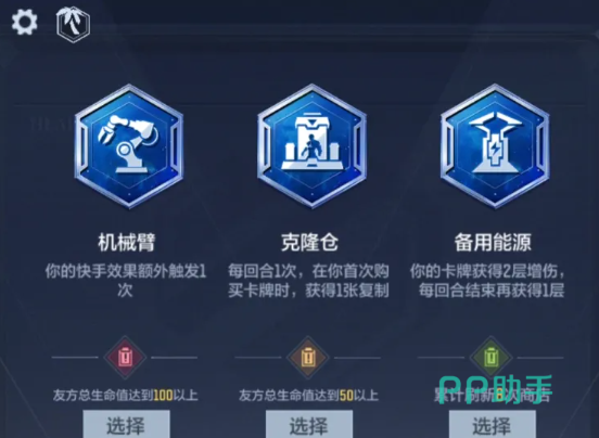 以快手流为例,其核心依赖高频触发机制,“机械臂”升级可使快手效果额外触发1次,直接强化连动节奏;若用于飞刀遗言流,则推荐“备用能源”,该效果提供2层初始增伤,并在每回合结束时再叠加1层,显著提升婵、猎鹰飞刀等遗言类卡牌的单轮爆发上限。