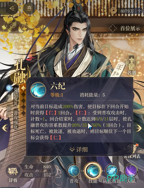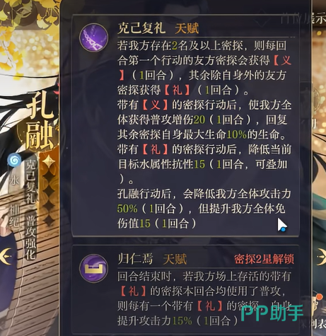 孔融的天赋技能“克己复礼”也是其强度的一大亮点。该天赋可以让队伍中的队友获得“义”和“礼”状态。拥有“义”状态的队友在行动后,会对全队进行普攻增伤,并恢复生命;而拥有“礼”状态的队友,则可以降低敌方目标的水属性抗性并叠加。这个天赋的设计非常具有战略深度,既能增强队友的输出,又能有效削弱敌人的防御,达到攻守平衡的效果。而且,这两个状态能够在战斗中持续存在,甚至可以在长时间的对抗中逐步改变战局,给予队伍更多的作战机会。