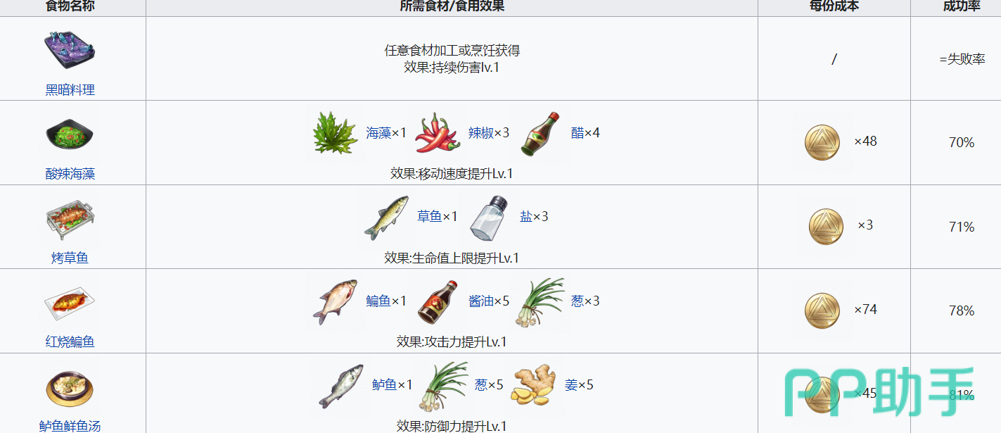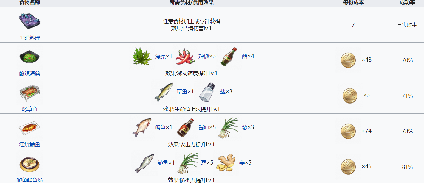 1级的食物大多数都是关于鱼类,所以想要解锁更多的食谱玩家的钓鱼技能等级也不能落下。基本上都是用不同的鱼类+调料进行烹饪,并且每一份烹饪都需要消耗金币成本,对角色的加成等级也比较低。