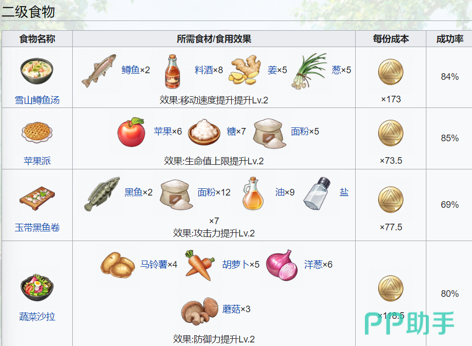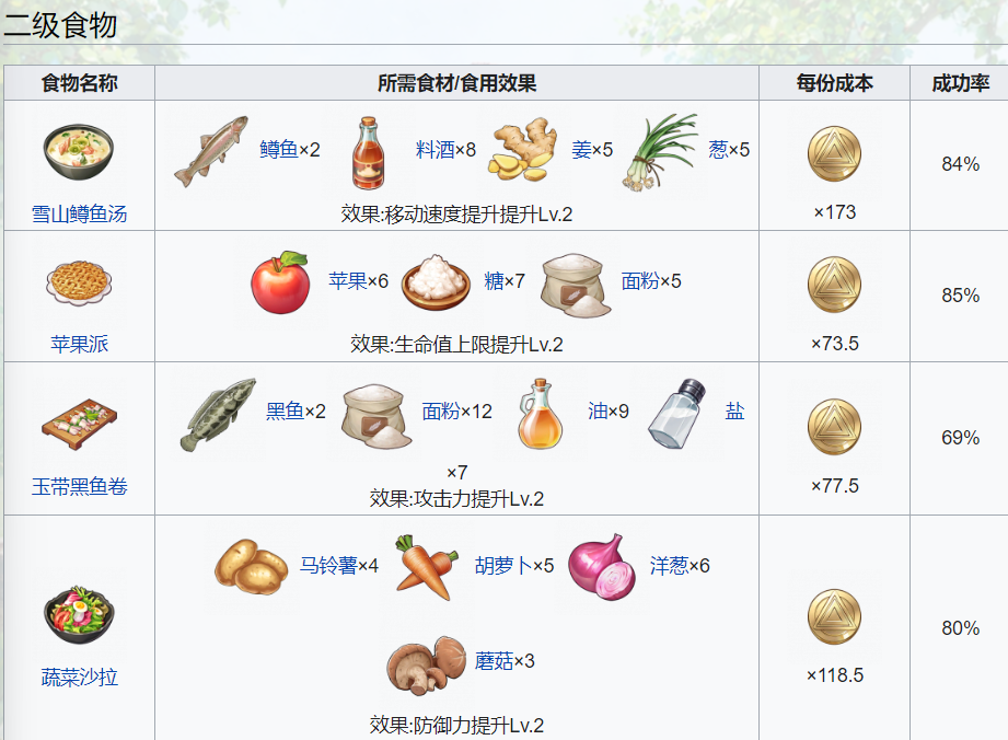 二级食谱的食材就更丰富一些,蔬菜和肉类都有,并且为角色附加的buff效果更好。当然同样花费的金币就更多一些,很多食材只能通过大世界的收集才能获取。食谱会随着玩家技能的升级二升级,也会解锁更多食谱。开放空间食谱一览就到这里分享结束。