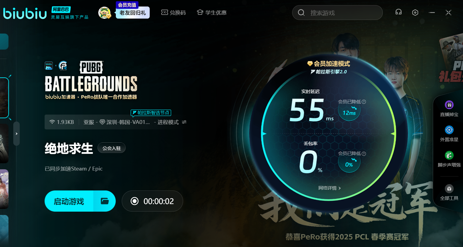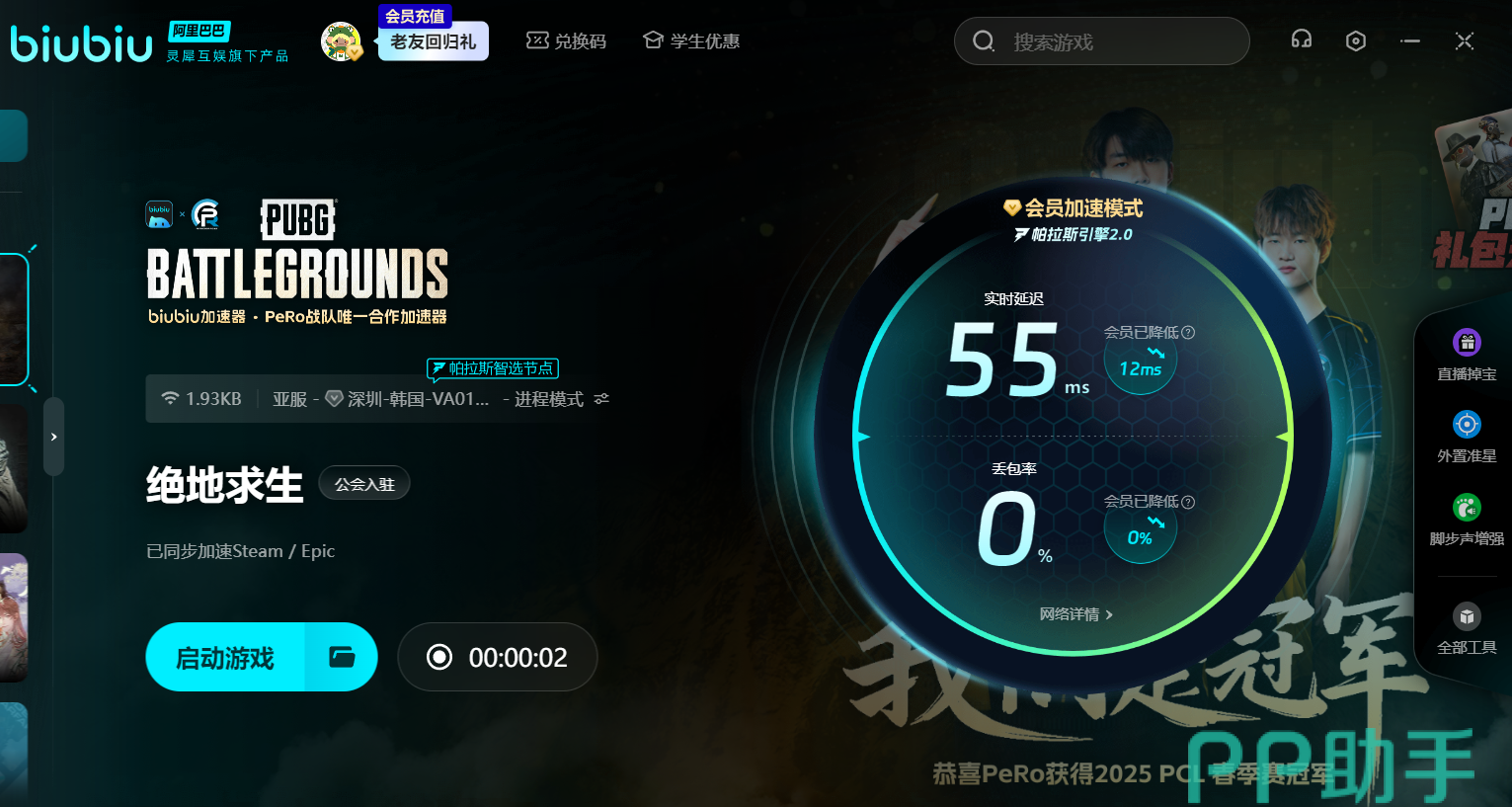 biubiu加速器堪称PUBG玩家的“网络神器”,作为2024绝地求生冠军联赛合作伙伴、PCL赛事官方指定加速器以及PeRo战队合作加速器,它的实力在顶级电竞赛事中得到了充分验证。职业选手在赛场上争分夺秒、分毫必争,biubiu能为他们提供稳定低延迟的网络环境,助力选手们精准操作、极限发挥,如此表现,足以证明其强大实力,自然也能为广大普通玩家带来同样出色的加速体验。