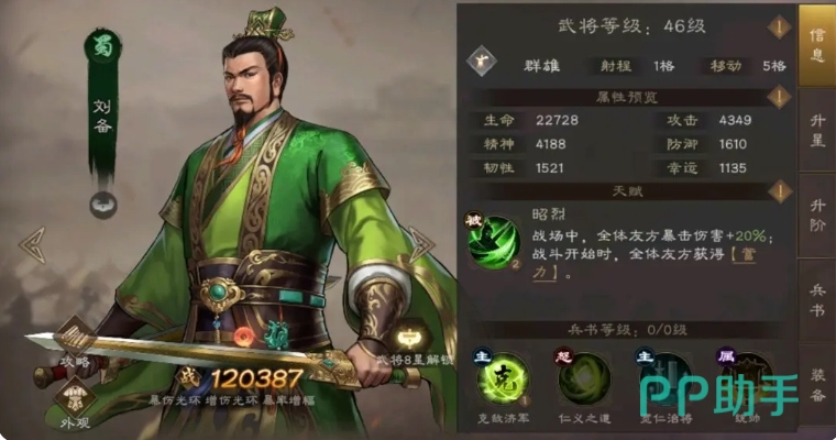 而在阵容构建中,第二个稀有卡的选择非刘备莫属,在关羽尚未完全成长起来之前,刘备的星级无需提升过高,6星便足以应对前期的战斗需求,游戏中有很多白送的君主自选包,这为玩家获取刘备提供了一定的便利,刘备堪称是最适配蜀国阵营的辅助型君主,这主要得益于蜀国阵营的核心战斗机制就是开局快攻打暴击。