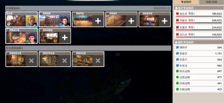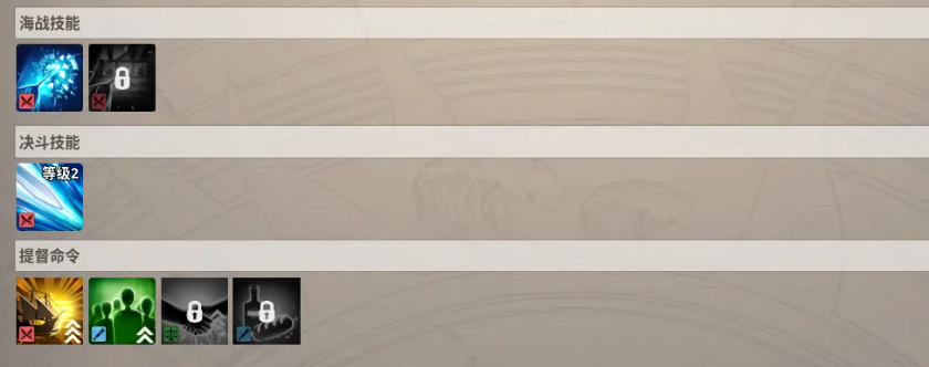 提督命令属于角色专属指令型技能,使用场景受限较严:海上战斗中仅可启用战斗类或冒险类命令;贸易航线中则启用贸易类命令,用于提升交易利润、降低关税损耗或加快货物周转效率。由于其功能性偏重于特定玩法模块,且对常规战斗贡献度低于前两类,故建议置于加点序列末位。需特别注意:所有技能等级提升均与角色等级同步生效,等级越高,属性加成基数越大;后续升级需消耗指定道具及红钻资源。技能须配置至“已启用技能栏”方可实际生效,且每位船员因职业定位不同,其可携带的核心技能数量与类型存在固有差异,合理搭配可最大化团队综合增益。