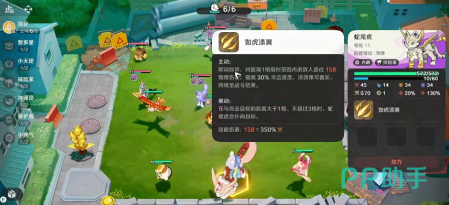 蛇尾虎的核心技能名为如虎添翼,该技能包含主动与被动双重机制。其主动部分表现为使用双爪进行近战打击,造成158点物理伤害,攻击范围为前方扇形区域,仅能影响一格距离内的敌人。由于覆盖面积有限,实际战斗中需注意站位调整,确保目标处于有效输出范围内,否则难以发挥最大效能。