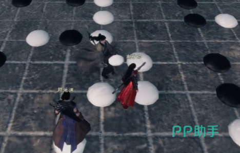 从典文君处获得线索后,前往后方圆形平台区域,此处有棋奴和棋侍两名守卫驻守,需将其全部击败方可推进任务进度。战斗结束后返回原处与典文君再次对话,选择“我已击败棋奴棋侍”选项。对话完成后,开始操作附近的棋子进行解谜环节。玩家需要将两枚白色棋子放置于指定位置,摆放正确后将激活机关,棋盘随之开启,通往隐藏地宫的道路正式打通。