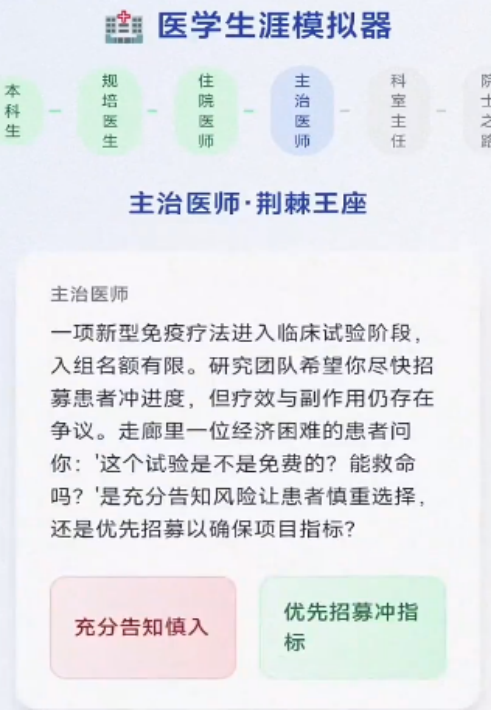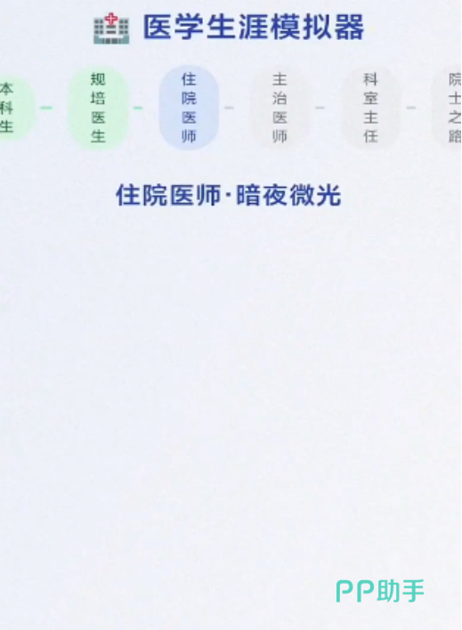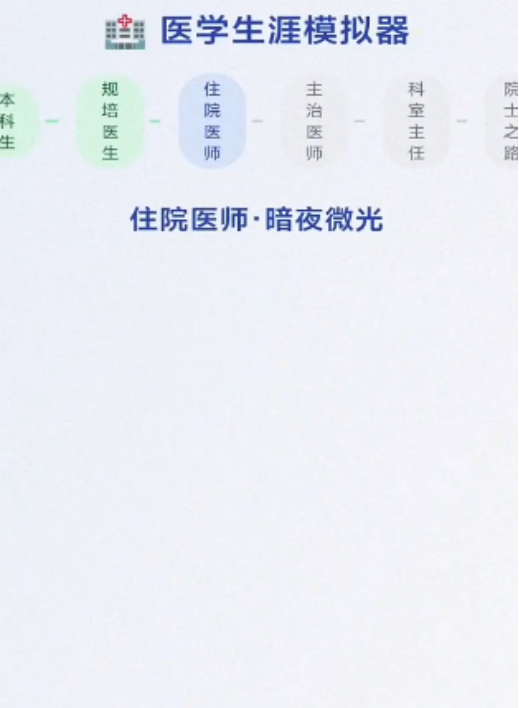 游戏开局即代入一名医学院新生身份,在兴趣驱动下开启系统性医学训练。从基础理论学习到实验室实操,从见习带教到独立接诊,每一步成长均需匹配真实医学逻辑——课程选择影响专科技能树分支,实习表现决定导师推荐权重,重大诊疗决策直接关联结局走向与行业声望值。场景设计深度复刻高校医学部、三甲医院手术室、标准化实验室等典型环境,强化沉浸式职业代入感。