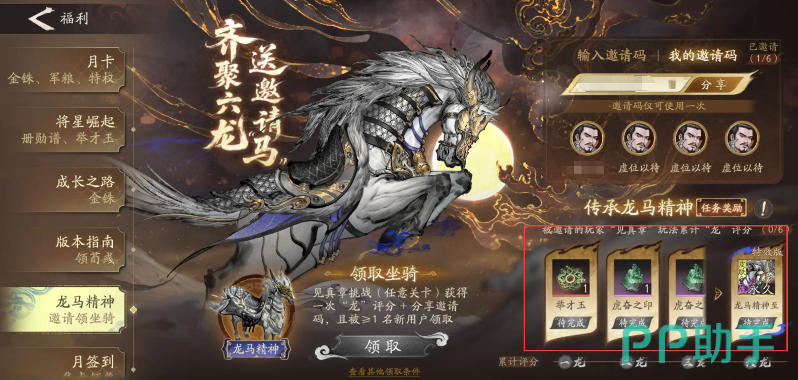 此外,新人玩家参与“齐聚六龙”邀请活动后,可在指定页面领取稀有坐骑“龙马精神”。每成功邀请一位新玩家并获得一枚龙印记,均可解锁对应奖励,包含副将自选礼包、龙镶之印、举才玉与虎奋之印。当集齐六位好友激活全部龙印记后,所有奖励都将收入囊中。