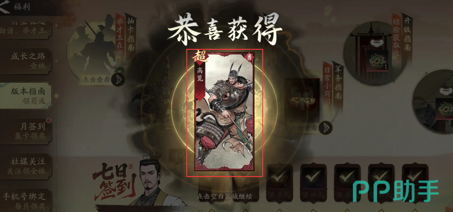 除预约福利外,游戏还设有开服七日签到活动。坚持每日登录签到,不仅能持续获取举才玉,第七天更能直接领取强力副将——高览,助力阵容快速成型。
