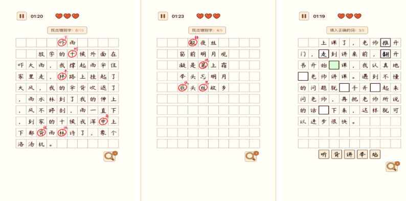 汉字找茬王是单纯寻找错别字的独立竖屏文字互动游戏,找错别字的规则简便但需要大家快速反应,真实手写的汉字呈现给人批改作业的既视感,汉字找茬与错别字鉴别的玩法超级有趣,古朴简约的美术也让这款汉字手游更有辨识度,随着等级提升也能解锁更多样的汉字主题玩法,各位汉字高手试着进入本作鉴别错别字吧。